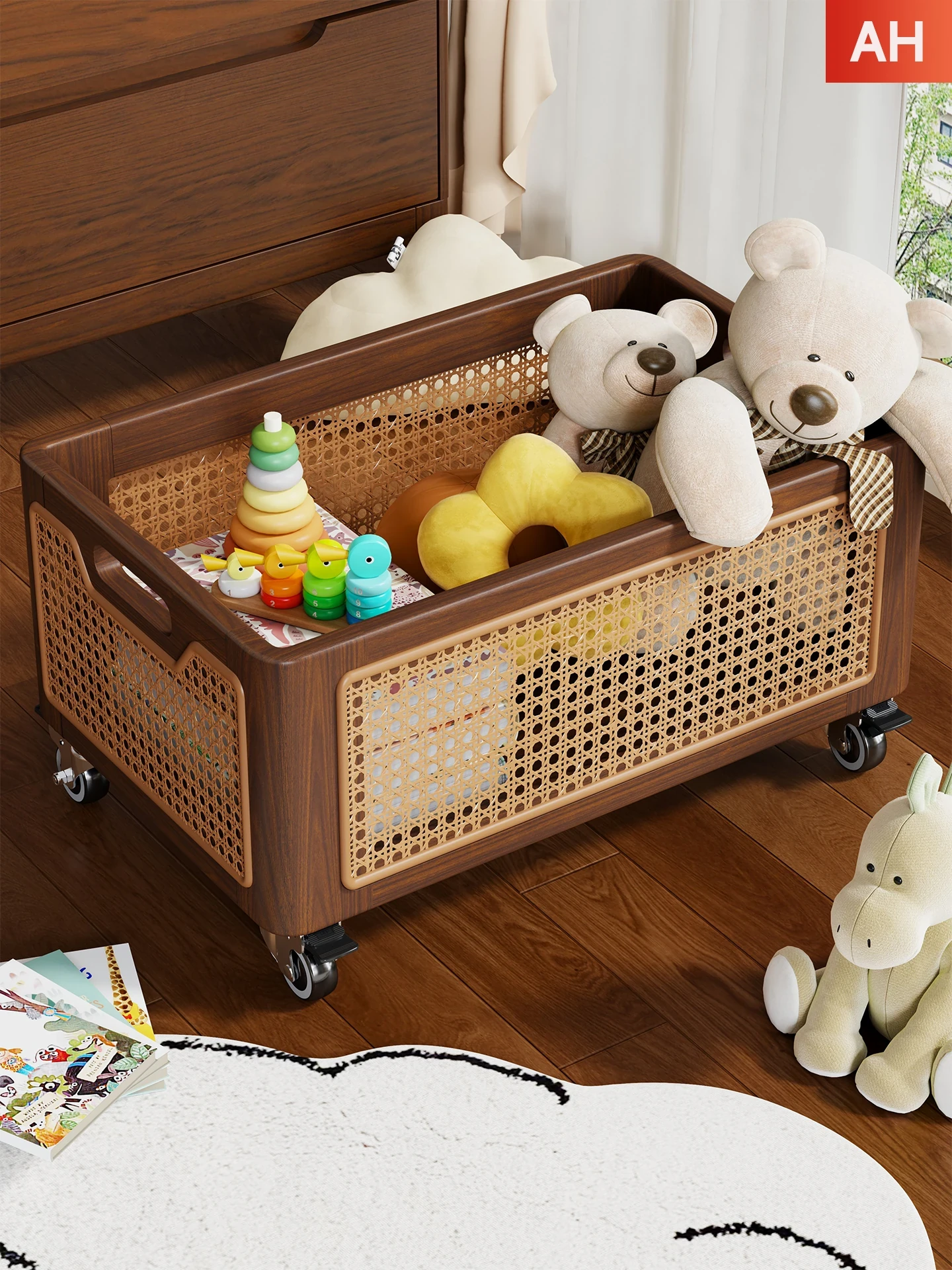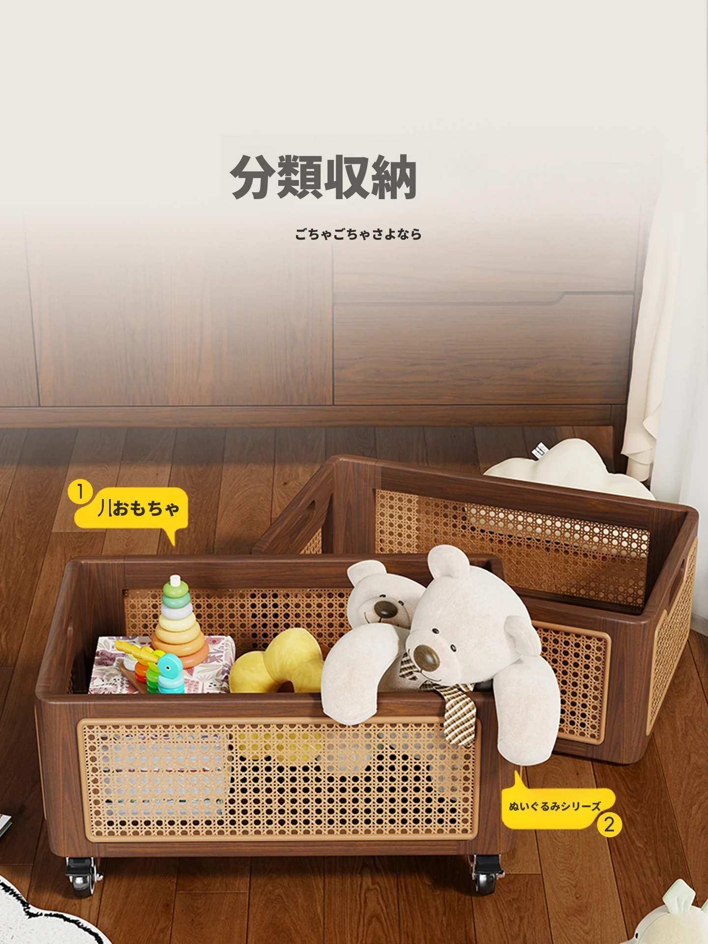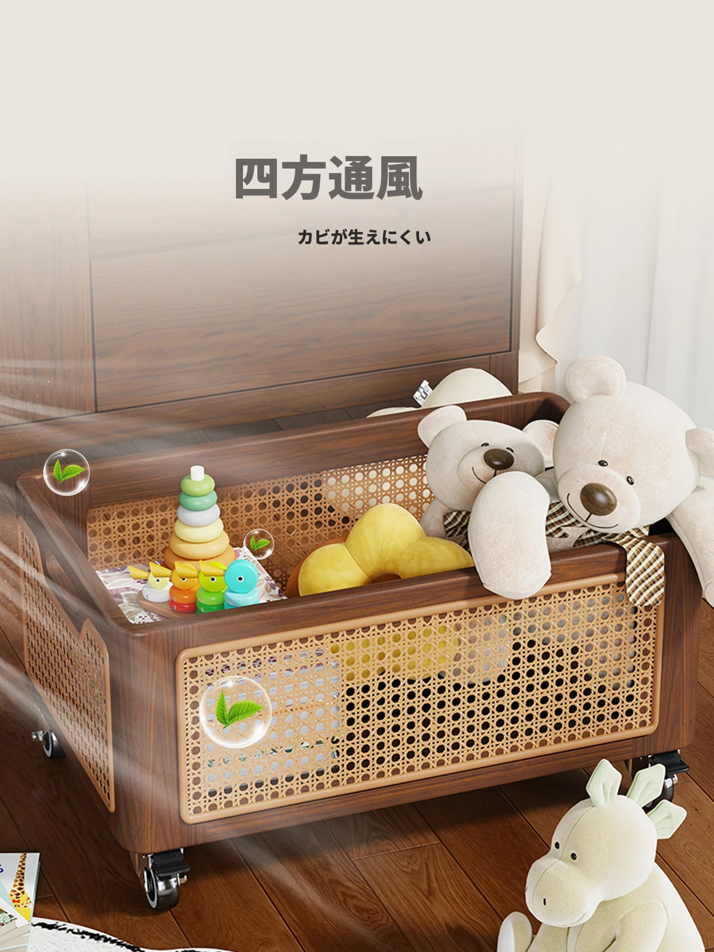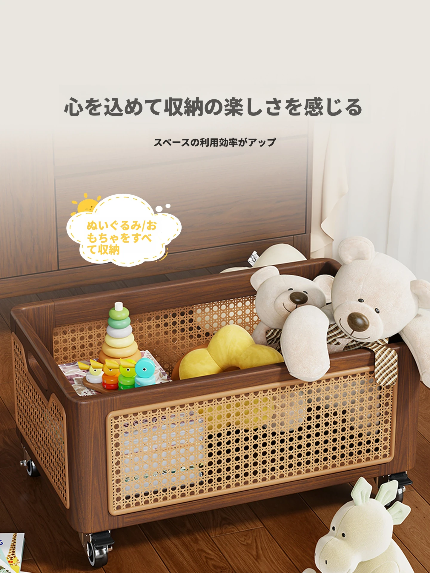 天然木製のおもちゃ収納ボックス|家庭用ラタン編み|子供向け大容量おもちゃ整理箱|赤ちゃんのスナック・ぬいぐるみ収納にも最適!おしゃれで機能的な収納アイテム!