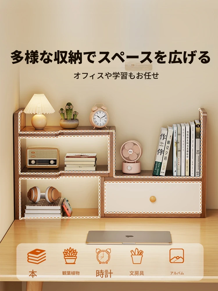 簡単組み立ての無垢材デスク用本棚!オフィスや家庭で活躍する収納改造の必需品。飾り窓の上にぴったりフィットするデスクトップ収納ラックで、整理整頓もスマートに!あなたのスペースを有効活用しましょう!