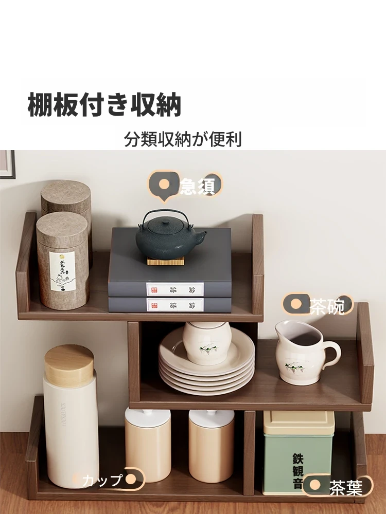 レトロデスク用茶具ディスプレイラック - 茶杯や茶葉を美しく収納し、ティータイムを格上げするスタイリッシュなインテリアアイテム!おしゃれなティーポットや茶器を引き立てます。