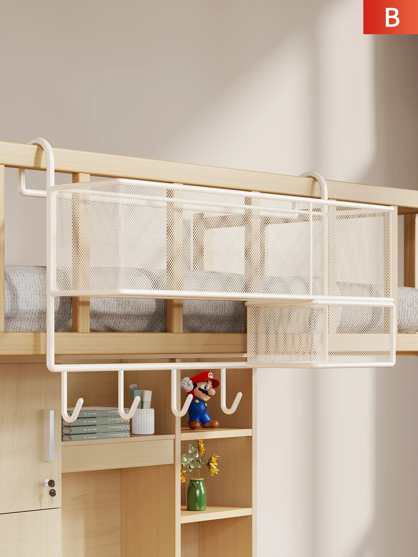 学生のための便利なベッドサイド収納!壁に穴を開けずに使える、おしゃれな寝室用ハンギングバスケット。上下 bunk ベッドにもぴったり!お菓子や小物の整理に最適な収納ラック。快適な学生生活をサポートします!