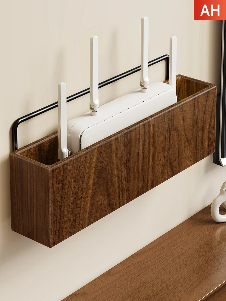 天然木製の壁掛け収納棚 - おしゃれで簡単取り付け、穴あけ不要!寝室やリビングに最適なルーターや本を整理するためのスタイリッシュなアイテム。空間を有効活用して、すっきりとしたインテリアを演出!