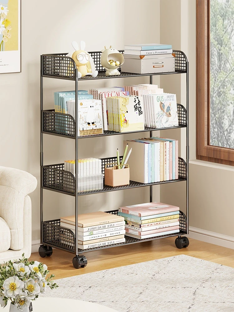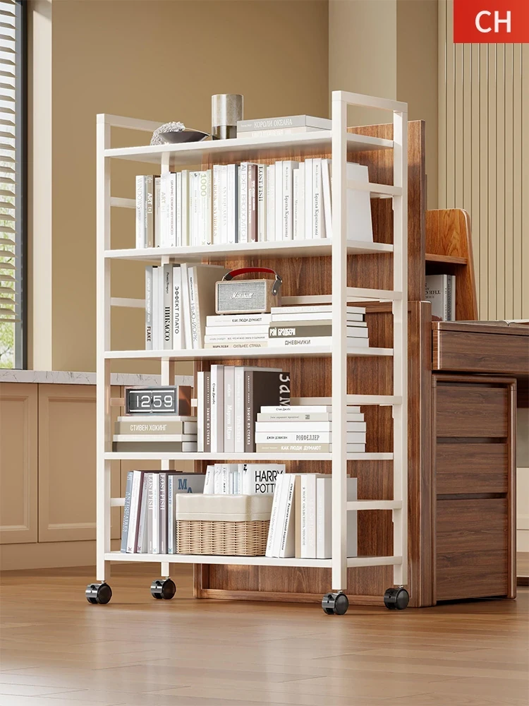 移動式ブックシェルフ 多段キャスター付き収納ラック お菓子や小物を整理できる便利なサイドテーブル付き読書収納キャビネット